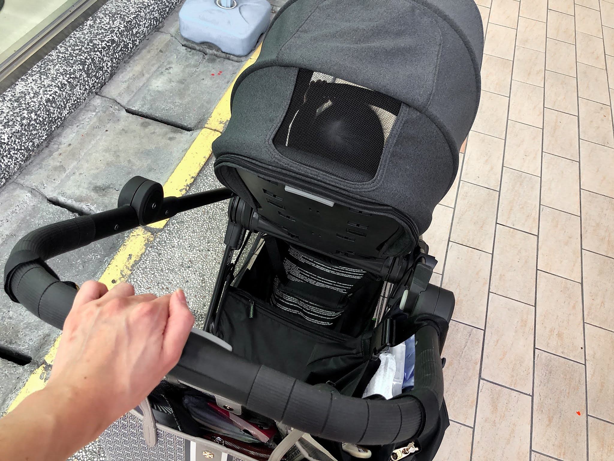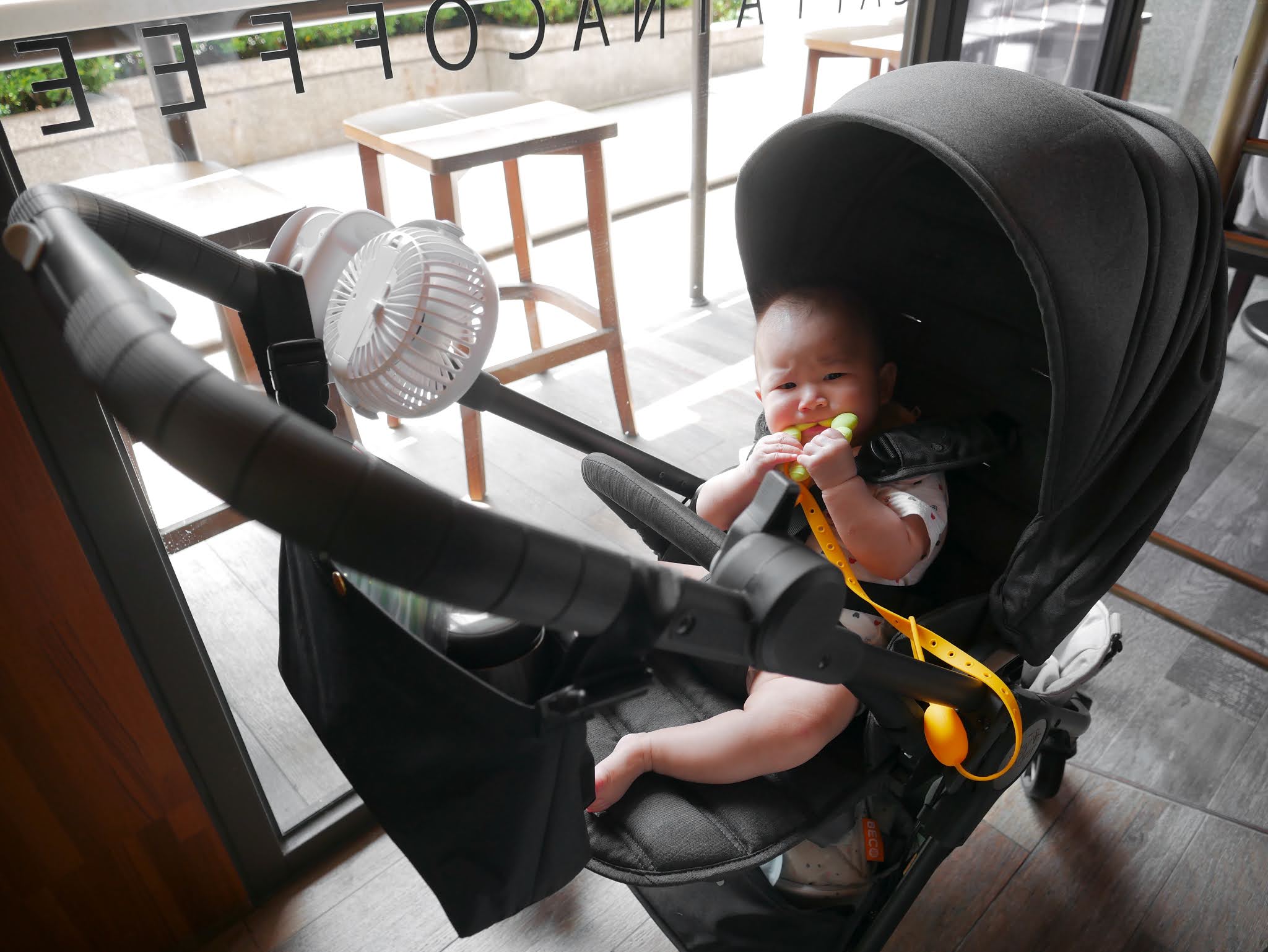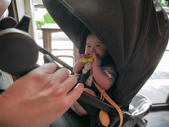 全罩式頂棚蓋著,整台推車彷彿變成她的小堡壘,讓她安心的觀察著新環境。