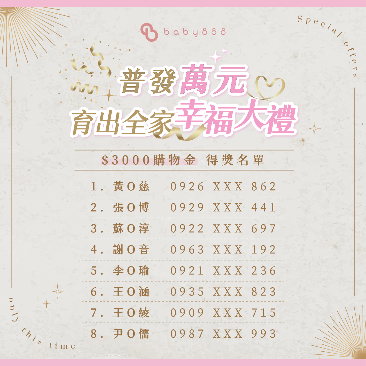 得獎名單將於2026/3/9 公佈於翔盛國際baby888粉專及IG帳號,得獎者請於抽獎完成公開後指定時間內,以私訊聯繫並核實登錄資料及身份,如無前來領取視為自動放棄權利,恕不另通知。