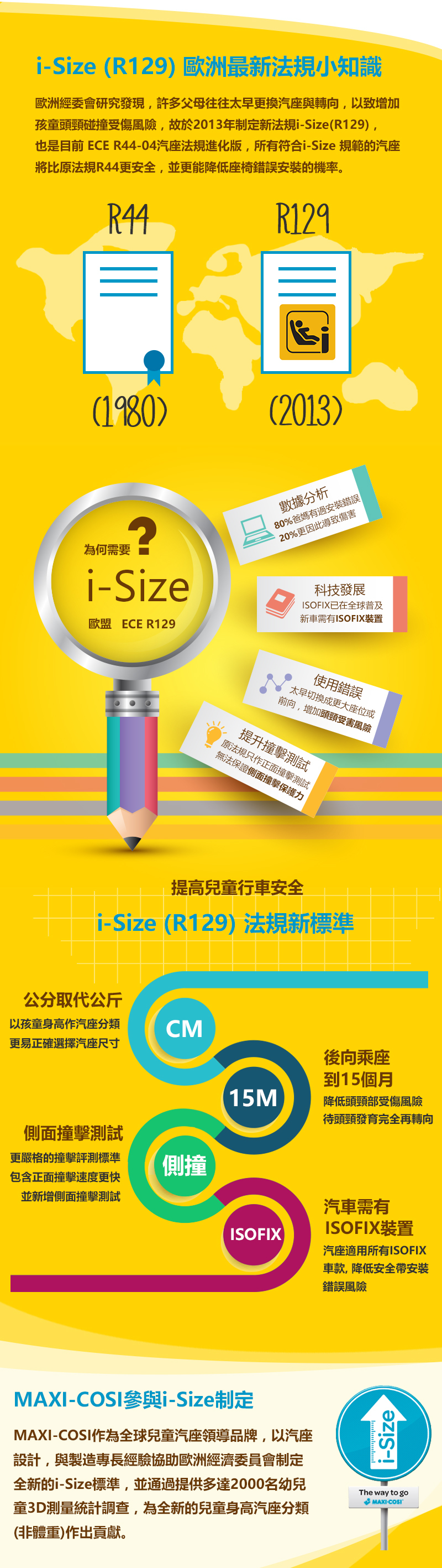 歐洲經濟委員在 ECE R44/04法規推行30年後,根據歷史數據研究發現,許多父母往往太早更換汽座與轉向,以致增加孩童頭頸碰撞受傷風險,故於 2013 年推出新法規 i-Size (R129),所有符合 i-Size 規範的汽座將比以前更安全5倍,並更能降低座椅錯誤安裝的機率,法規包含: