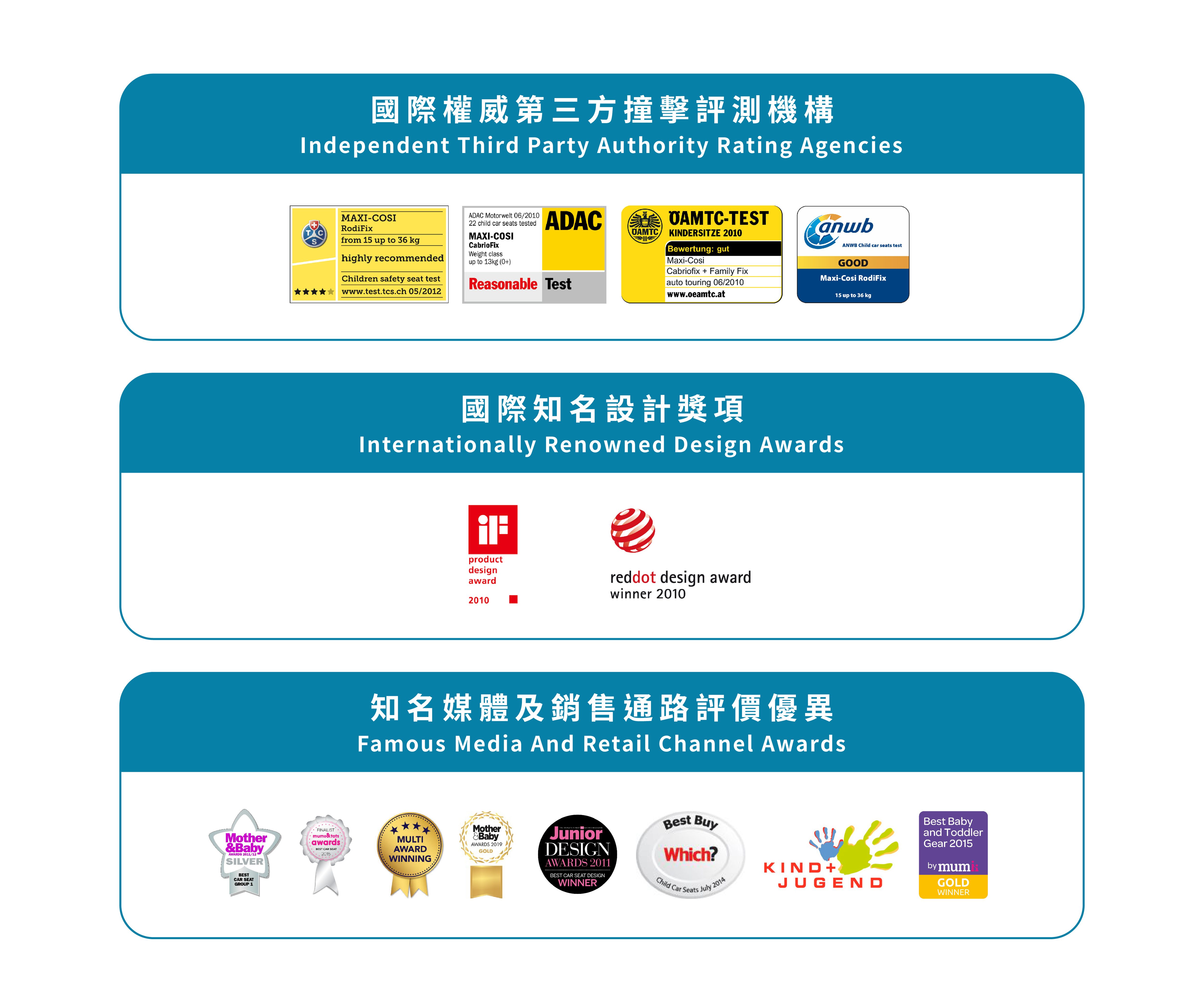 台灣檢測標準CNS11497,全系列汽座更榮獲全球第三方權威-德國ADAC車測機構,四星級以上評價,