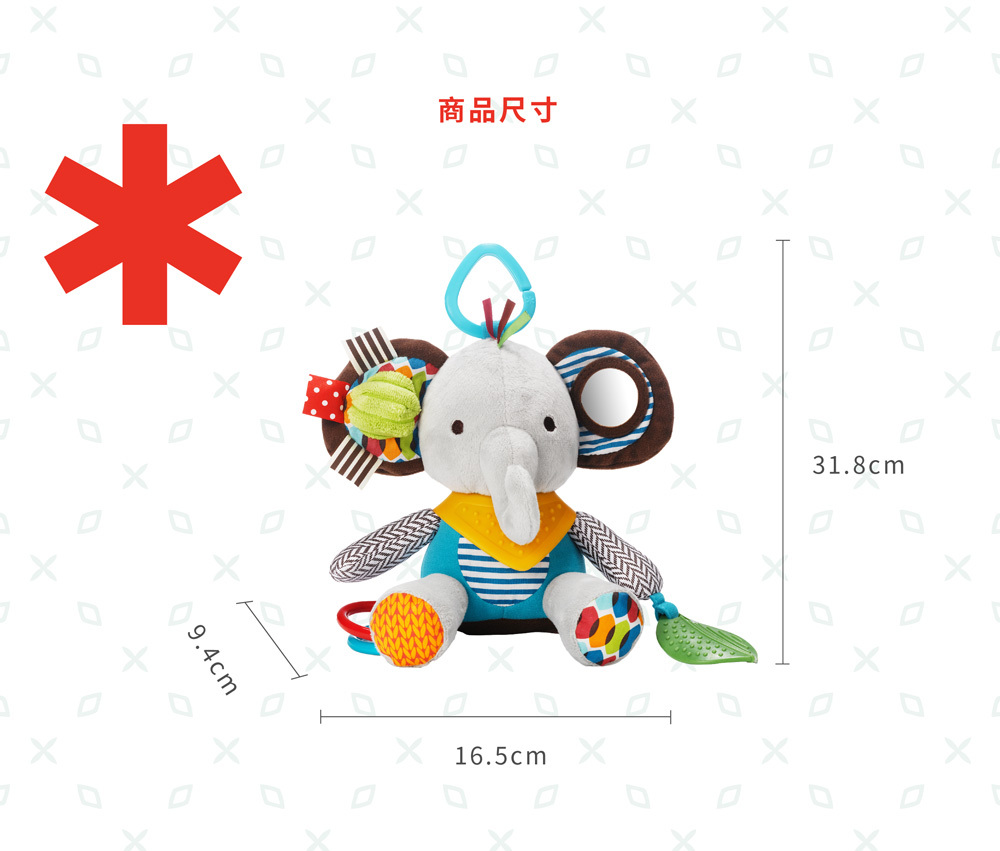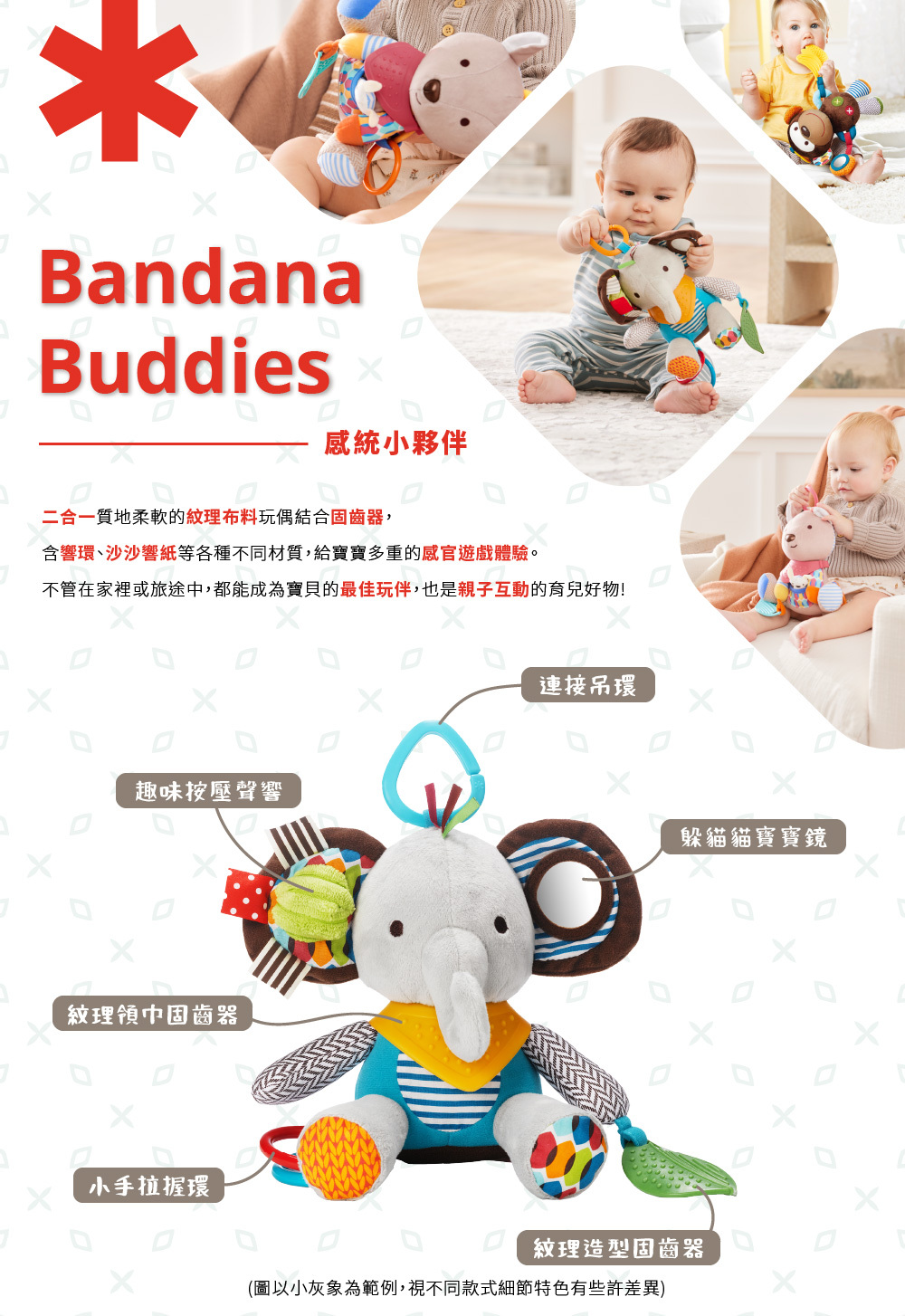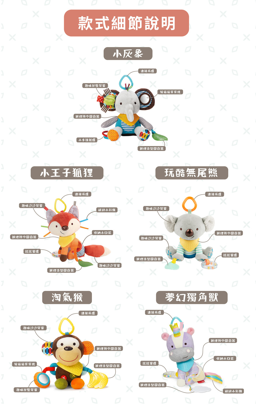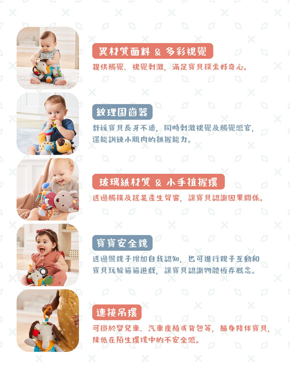 ✱ 各樣細節設計: 異材質面料、小手拉握環、搖搖響環、沙沙響紙、紋理固齒器、小鏡子及有趣吱吱聲等 (各款式含不同細節設計)