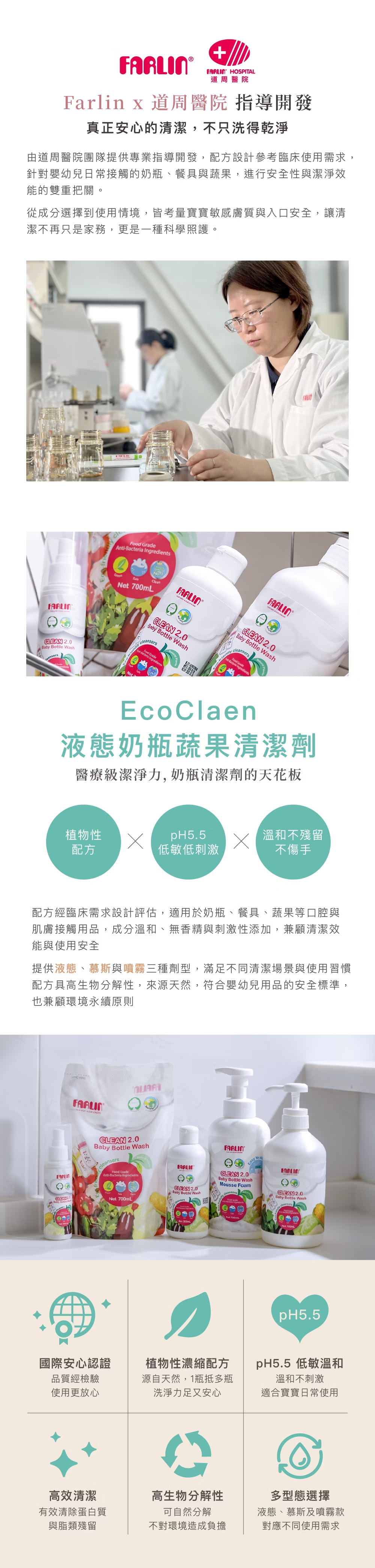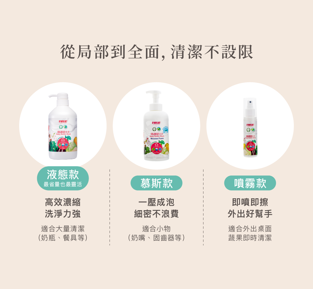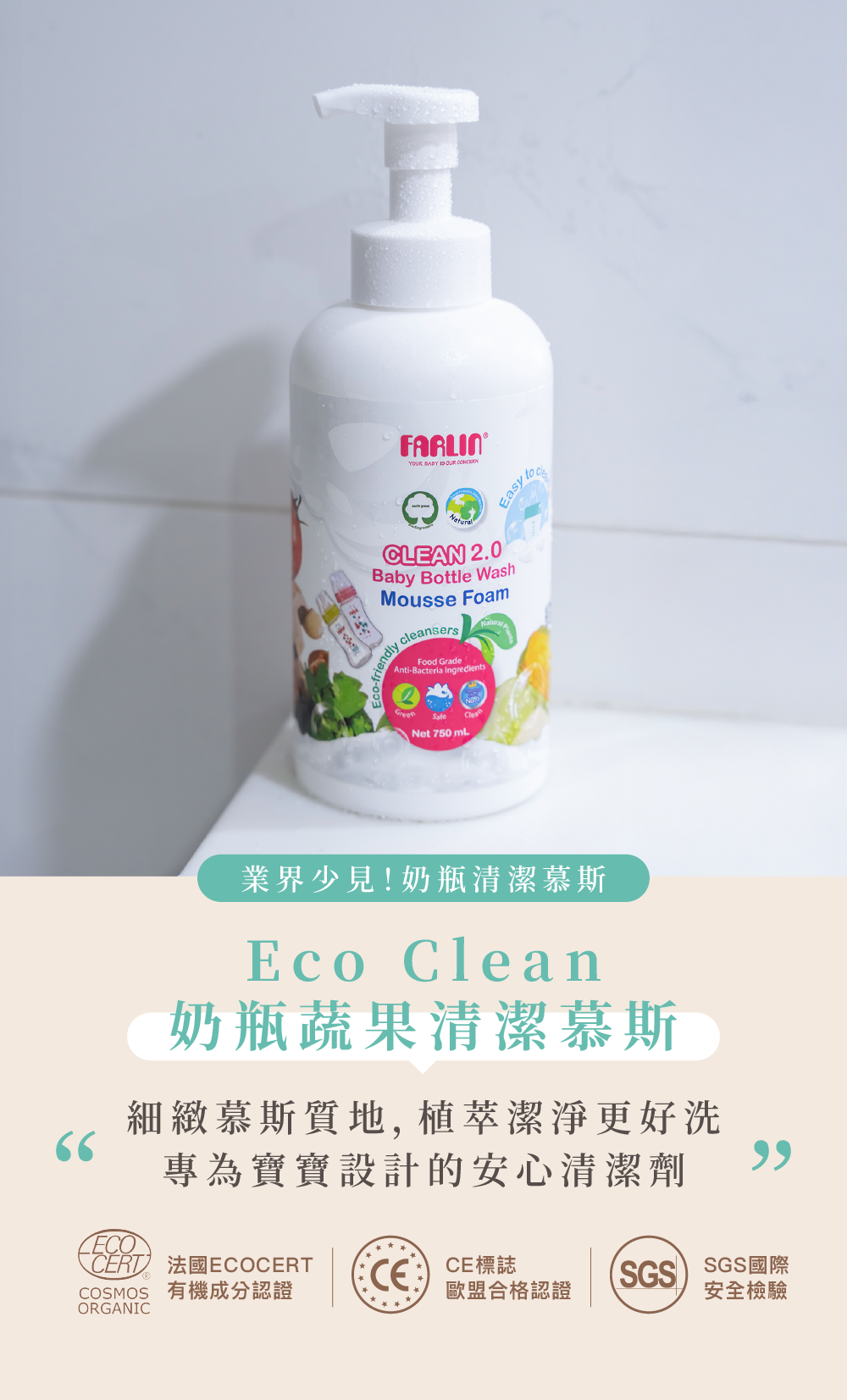 A:Farlin 重視品質,全系列 Eco Clean 清潔用品皆通過 SGS 與國際檢驗,並 投保新生產物保險 2,000 萬產品責任險,提供最深層的安心保障。