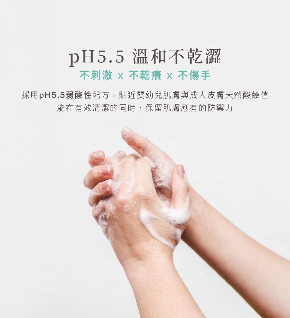 •  pH5.5 弱酸低敏不傷手:貼近肌膚天然酸鹼值,配方極致溫和。實驗測試洗後不乾澀、不刺激。