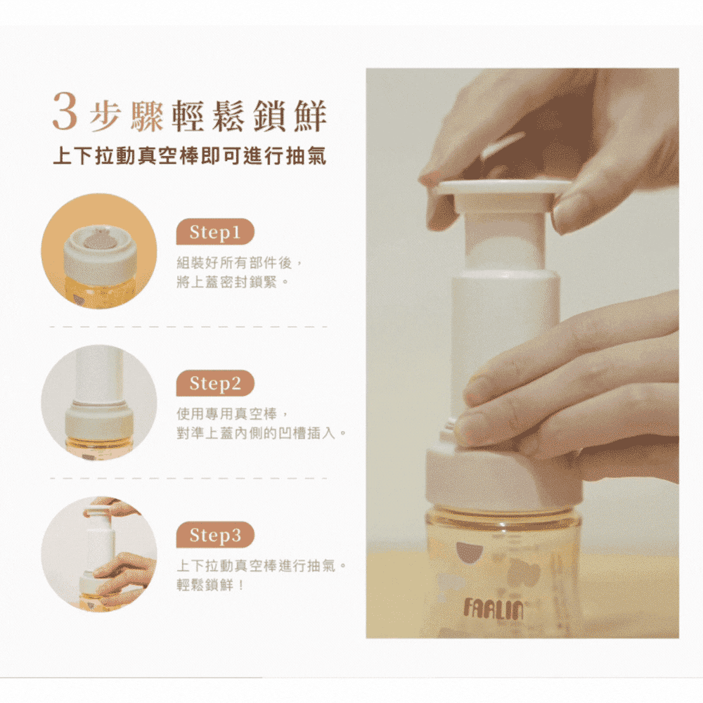 • 真空保鮮需配合 FARLIN 專屬真空配件使用,抽氣時請觀察密封蓋指示。